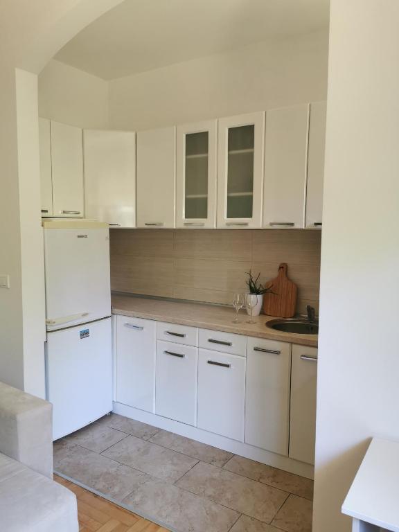 čajna kuhinja, frižider, mikrotalasna rerna, kuhinja, posuđe, rerna, ploča za kuvanje, sto za ručavanje, čaše za vino